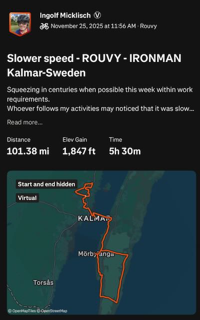I know some might mainly look at my cycling activities and I try keeping them up somehow decent. Simply enjoy the hobby a lot. This year I noticed that I got a bit sloppy on other activities that do support my cycling performance. Last 2 years I always had some weight training, stretching/yoga and barefoot walking and running included in my regular procedures. Sadly sometime earlier this year I stopped the walking and running part. OK running is a bit borderline for me due to fear that I may cause some issues (had a major stress fracture in my left leg a few years ago that caused me to almost loosing my leg ... so I am nervous about that). Nevertheless I noticed the negative effects for not doing the regular barefoot walking. That made me pick up slowly barefoot walking a few weeks ago and I try keeping it in my mix of activities almost daily. Cool thing ... specifically last weekends on my endurance training rides I start notice the great effects on my feet again and happy I am back into it. It should help me on the last activities this year and be great preparation for my goals in 2026. Ohhhh ... even I dropped the running ... I am considering to mix in 1-2 mile running barefoot latest in December. With that I may do a 5k race again early 2026 ... just to proof to myself that its doable 🙂 Stretching and some minor weight training better stay in my routine weekly as well. Hardly record those at the moment but enjoy those as well. Its normally after my other activities.